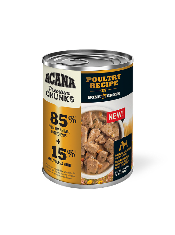 Cada lata de ACANA.® Premium Chunks se elabora pensativamente de principio a fin. Nuestra receta de aves de corral en Bone Broth se elabora con 85%* ingredientes animales, incluyendo trozos de aves de corral de primera calidad, equilibrados con 15%* - frutas y verduras visibles, todo en una base de caldo de hueso salados. Añádalo como topper en su perro favorito ACANA kibble para proporcionarles más hidratación y sabor digno de antojo, o alimentarse solo para una delicia indulgente a la hora de comer.