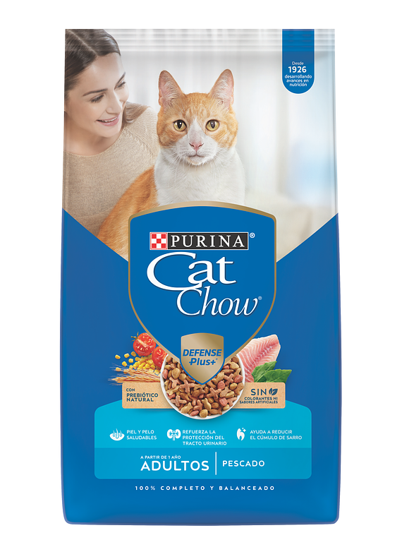 El nuevo PURINA CAT CHOW ADULTOS DELICIAS DE PESCADO CON DEFENSE PLUS ofrece los nutrientes que tu gato necesita para mantenerse bello y saludable. Contiene Pescado, rico en Omegas 3 & 6, que ayudan a tener una piel y un pelo saludables.