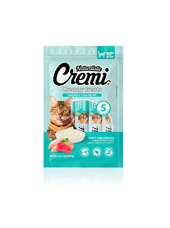 Snack cremoso para gatos de todas las edades. Elaborado con carne de pollo y atún, y reforzado con taurina aminoácido esencial para los gatos. La fórmula además contiene extracto de té verde que tiene un alto poder antioxidante. El alto porcentaje de humedad promueve la hidratación junto con un aporte calórico controlado de sólo 6.9 kcal por tubo de Cremi. Excelente opción para utilizarlo con juguetes interactivos, congelarlo en épocas de calor o reducir el estrés al momento de dar un medicamento. Cremi es la mejor opción para fortalecer el vínculo con tu gato.