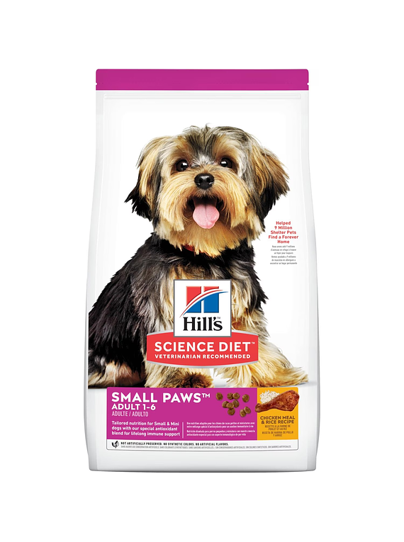 Grande en amor, pequeño en tamaño.™ El alimento seco para perros Hill's® Science Diet® Small Paws™ Adult es nutrición diseñada para las necesidades únicas de los perros pequeños y miniatura durante los mejores años de su vida. Hecho especialmente en bocados pequeñitos.