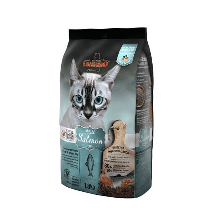 LEONARDO® Adult Salmon GF es un alimento libre de grano y gluten indicado para gatos adultos con sensibilidad alimentaria. Formulado con salmón extra fresco. La receta incluye amaranto en lugar de cereales. Exquisito sabor a salmón para los mininos amantes del pescado.