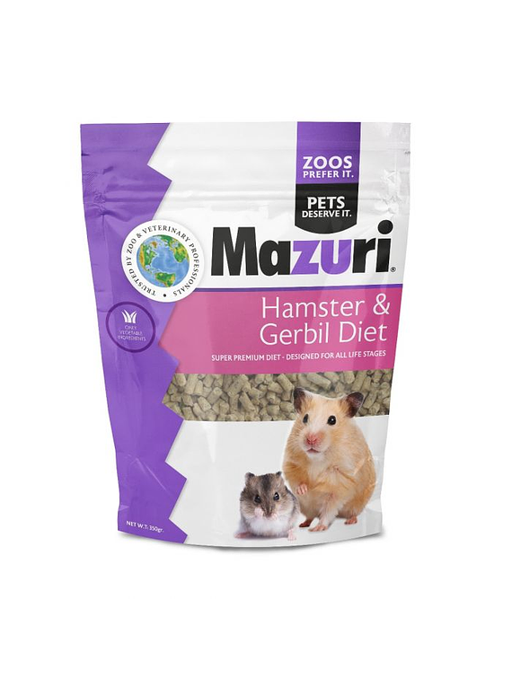 Hamster & Gerbil Diet de Mazuri es una dieta completa y balanceada para todas las etapas de crecimiento en Hamsters y Jerbos. Contiene sólo ingredientes de origen vegetal, libre de harina de pescado. Puede ser usado como única fuente de nutrientes y no requiere ningún tipo de suplementación alimenticia (vitaminas, minerales). Dureza de su alimento ajustada para un adecuado desgaste dental y salud oral.