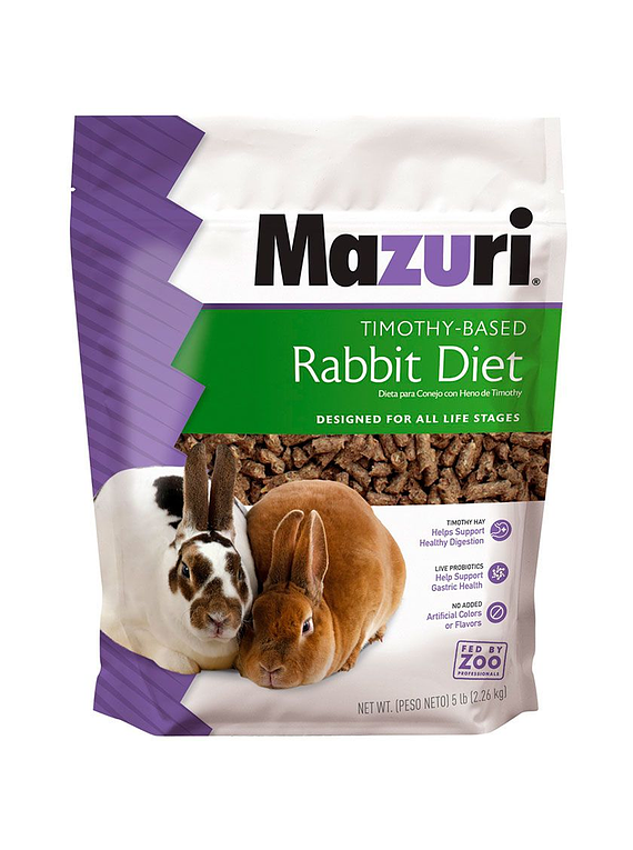 Alimento completo para conejos formulado en base a pasto Timothy (Libre de alfalfa), lo que determina una dieta con mejor balance Calcio/ Fósforo, que previene la formación de cálculos urinarios. Dieta peletizada que promueve un sano desgate dental y mantiene la salud digestiva. Contiene Vitamina C estabilizada, Probióticos, Vitamina E, Yucca Shidigera que disminuye el olor de las deposiciones. Dieta libre de maíz (previene la obesidad). Nutricionalmente completo, no requiere suplementación.